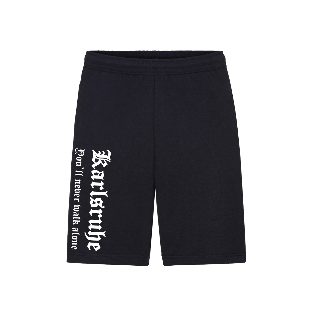 Kurze Hose in dunkelblau mit Aufdruck: „Karlsruhe - You`ll never walk alone“ auf dem rechten Hosenbein.