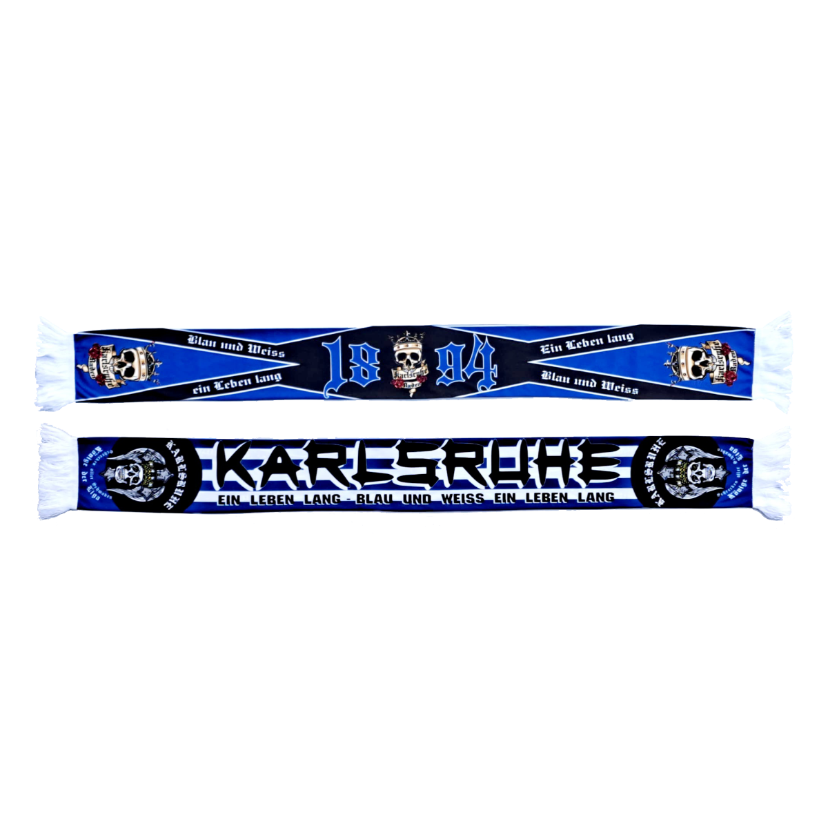 Auf der Rückseite steht mittig groß der Schriftzug "KARLSRUHE", darunter ,,EIN LEBEN LANG BLAU UND WEISS EIN LEBEN LANG". An beiden Schalenden ist unser Totenkopf-Logo "KARLSRUHE - Schrecken aller Schwaben, Könige der Liga".