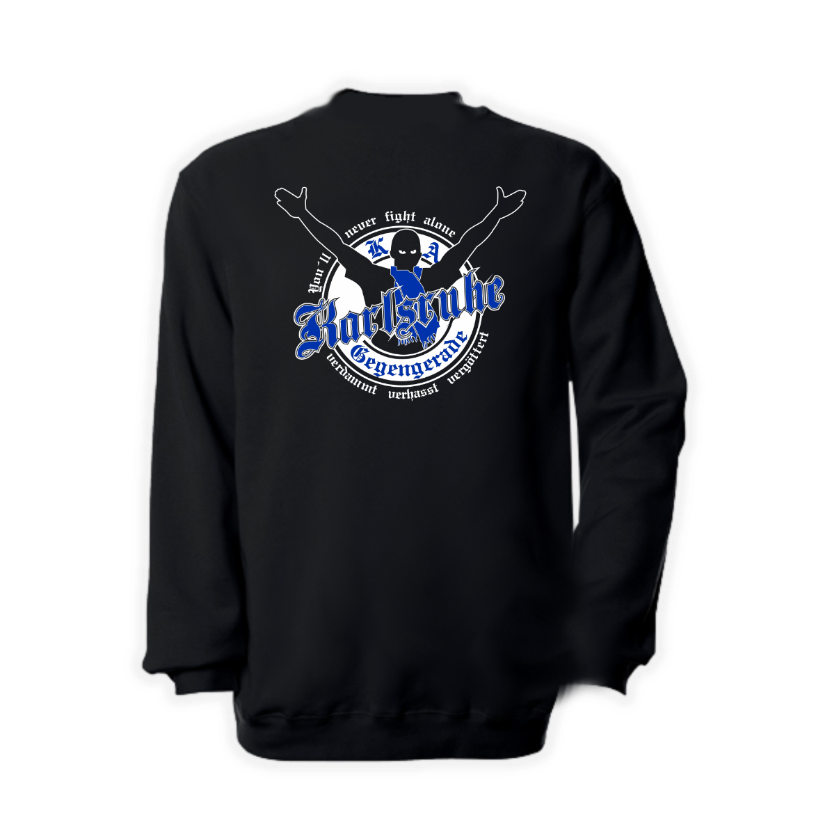 Rückseite bedruckt mit unserem Motiv "You'll never fight alone - KARLSRUHE - verdammt, verhasst, vergöttert" (Armausstrecker).